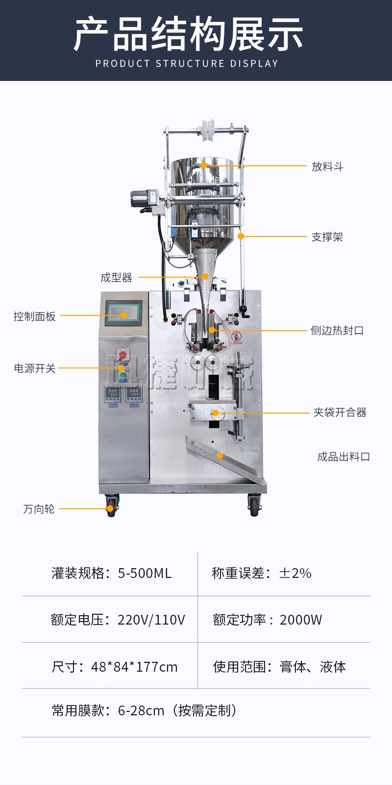 光电跟踪及无极调速于一体,可周期完成下料、计量、日期打印、制袋、充填、封合、热压批号、分切计数等作业。