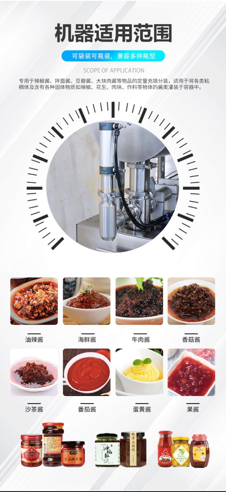 半自动酱料灌装机适用于辣椒酱、豆瓣酱、拌面酱、大块肉酱等物品的定量充填分装,适用于将各类粘稠体及含有各种固体物质