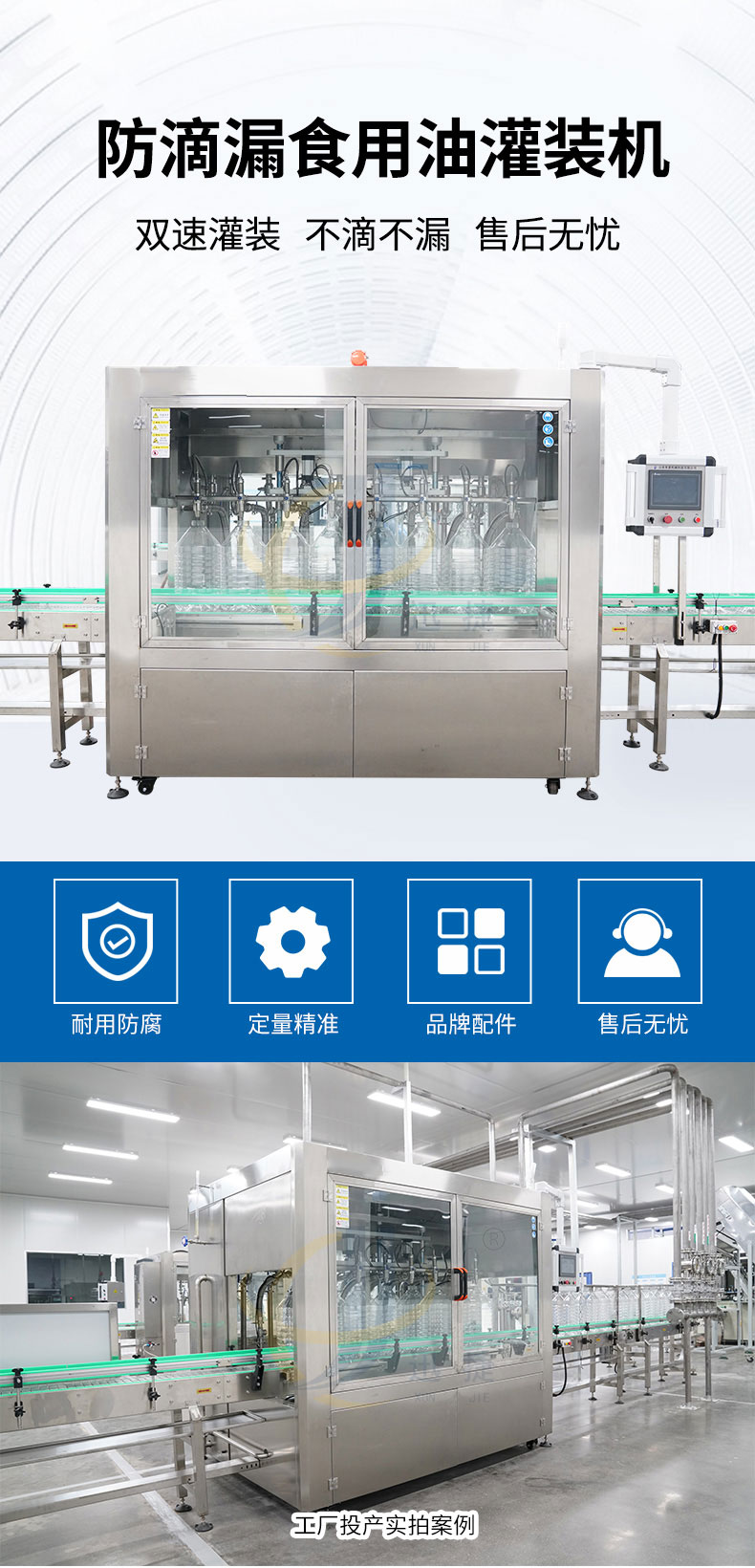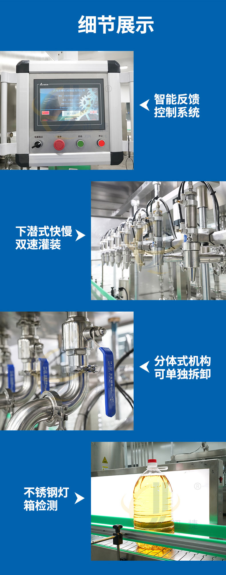 全自动八头食用油灌装机单头单泵单变频控制,容积和质量两种计量方式自由转换,灌装调节方便快捷。