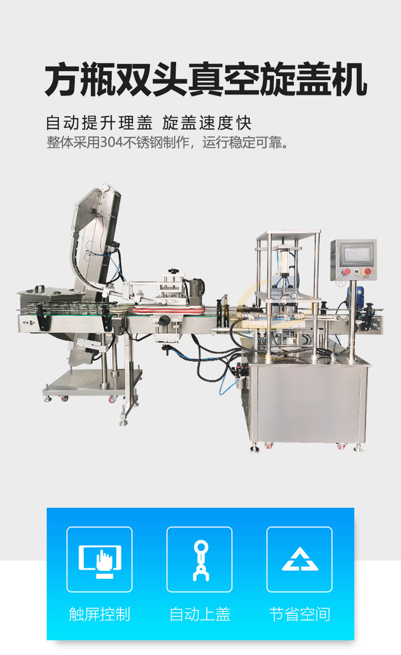 方瓶双头真空旋盖机独特的设计,可兼容多种不同形状,尺寸的瓶子旋盖,兼容性强,且调整方便;真空压力可调,触摸屏人机界面操作简单方便。