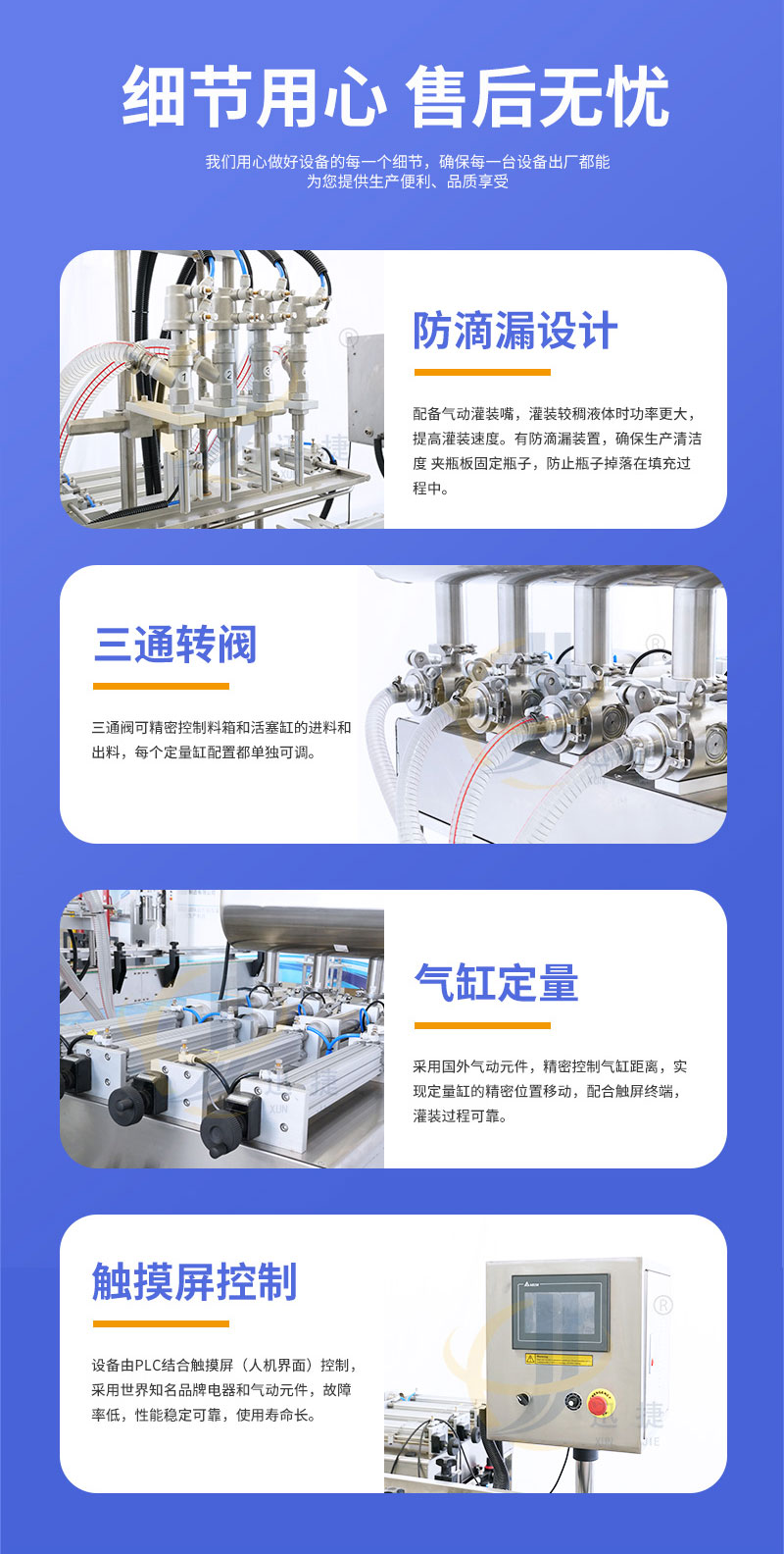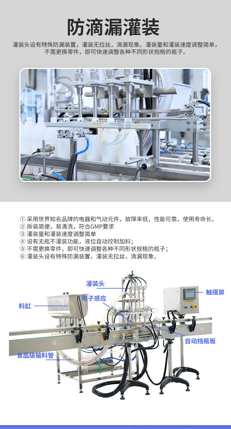 全自动膏液灌装机适用于食品、饮料、化妆品、日化和制药行业。灌装头设有特殊防漏装置,灌装无拉丝,滴漏现象。