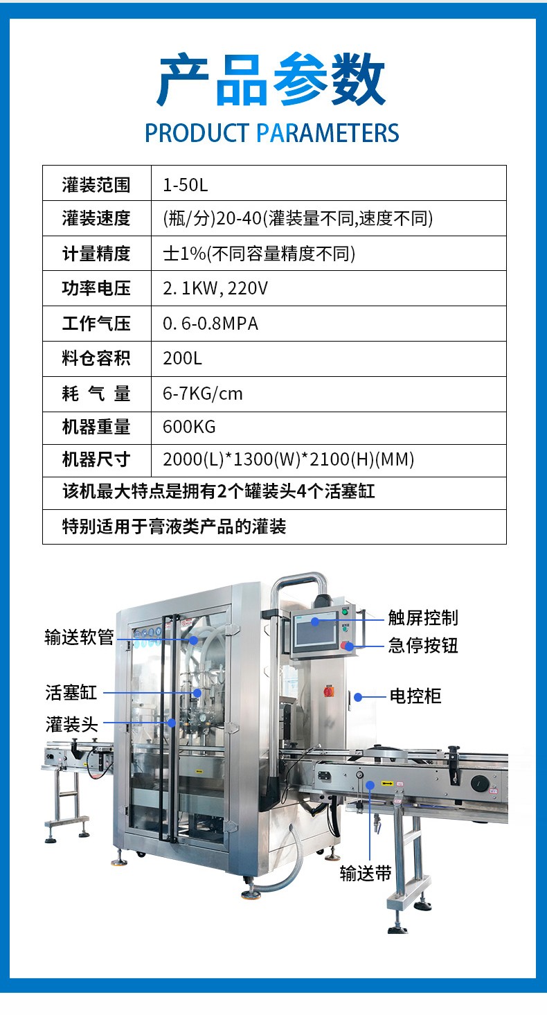 跟踪式调味酱灌装机设备配置定量灌装、定液位灌装两种方式,计量误差2克。定量灌装保证每一瓶的灌装质量。定液位灌装可让每一瓶的液位都齐平,不会因为玻璃瓶的重量差,误差产品卖相。两种模式,只需要一键切换。